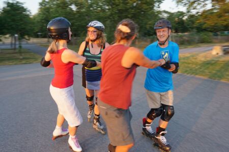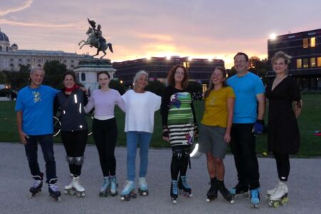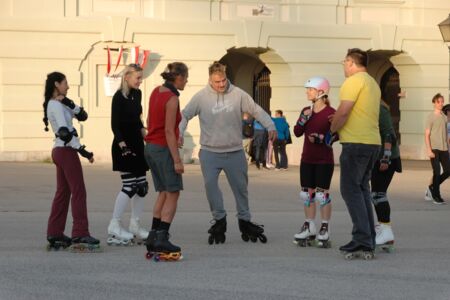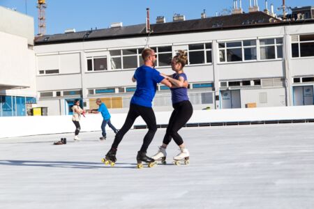 Ein paar begeisterte Rundtänzer und Rundtänzerinnen des Tanzkreises haben nach dem Ende der Saison 20/21 im Sommer ihre Schlittschuhe gegen Inlineskates oder Rollschuhe getauscht. Wir haben regelmäßig in Kaisermühlen an der Neuen Donau und vor der Wiener Hofburg am Heldenplatz getanzt. Höhepunkt war für uns das Tanzen auf den glatten Betonplatten des Wiener Eislauf-Vereins, ein seltsames Gefühl, kennen wir unseren Platz doch sonst nur mit einer Schicht Eis überzogen.